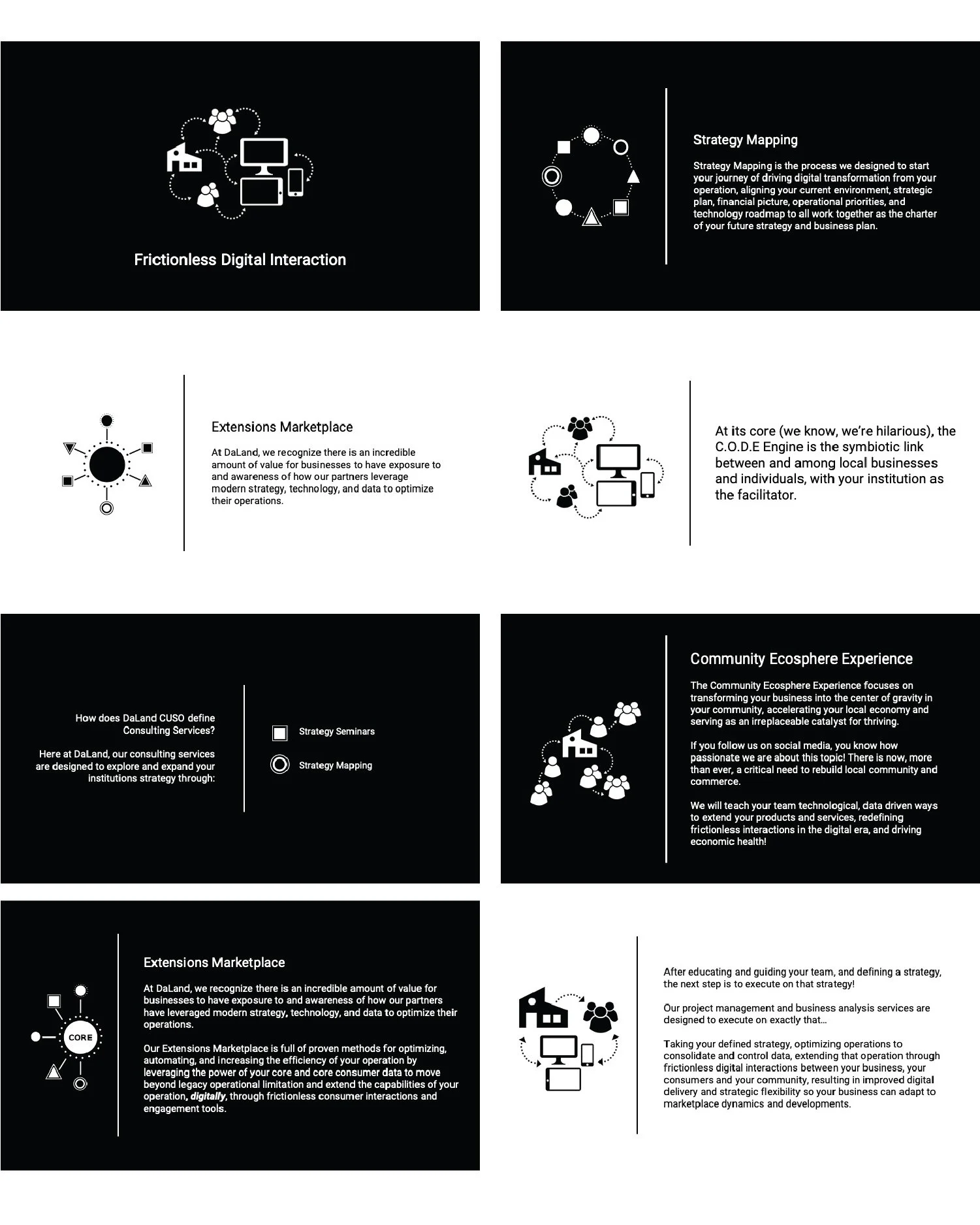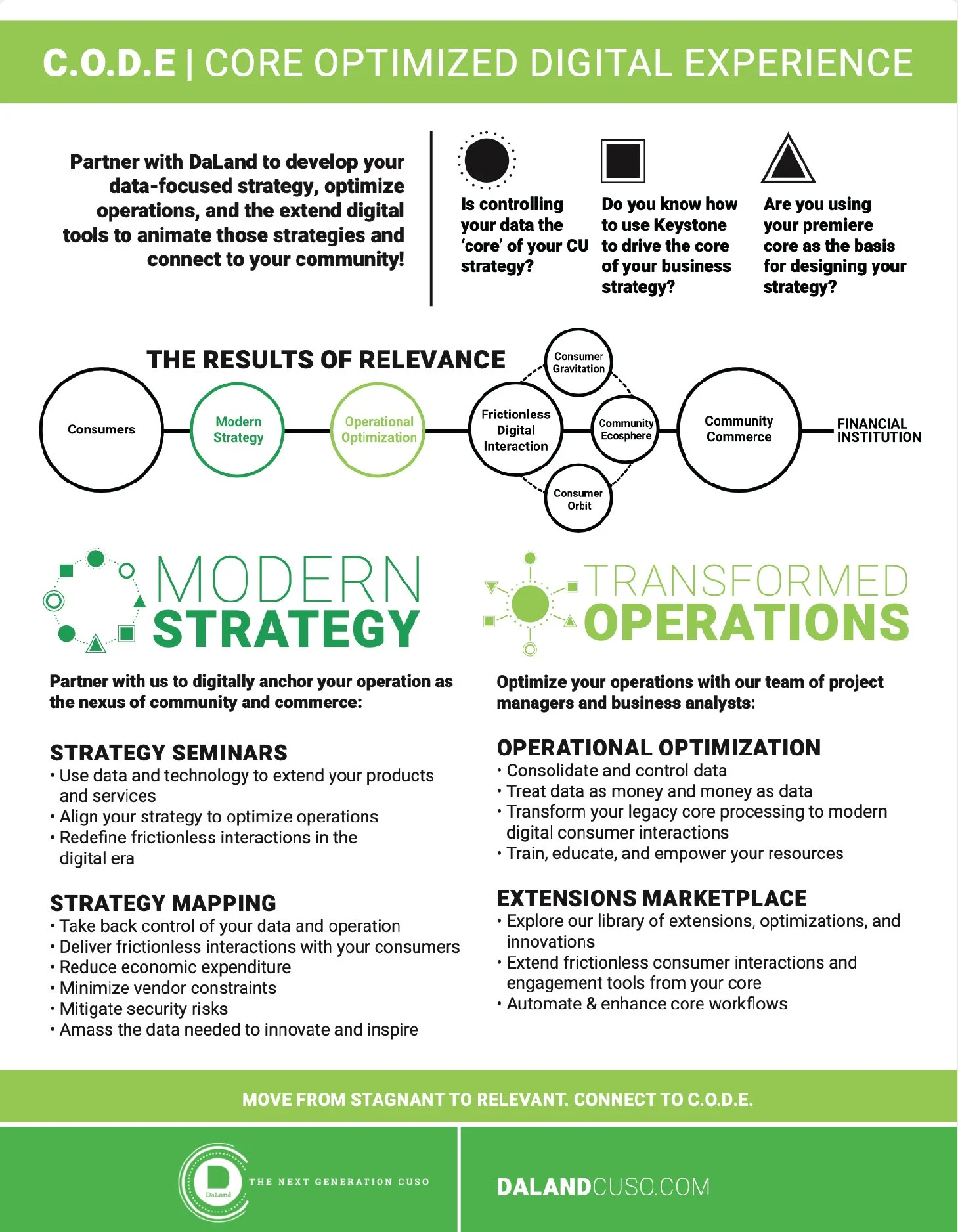 Modern strategy – we intentionally chose modern strategy so it would separate strategy from planning, which is often associated in our industry. Many orgs will conduct strategic planning exercises, but, if it’s not modern, if it’s not focused on aligning technology deployment and the operations needed to support it, what’s the point? It’s perpetuating the same old mediocrity that will prevent growth, community engagement, i.e. relevance. A modern strategy is focused on how an FI’s existing or incoming technology can be deployed, and current operations transformed, in order to relevantly engage their membership and local community. i.e. through relevant products and services that meet modern community member needs, expectations, and demands.